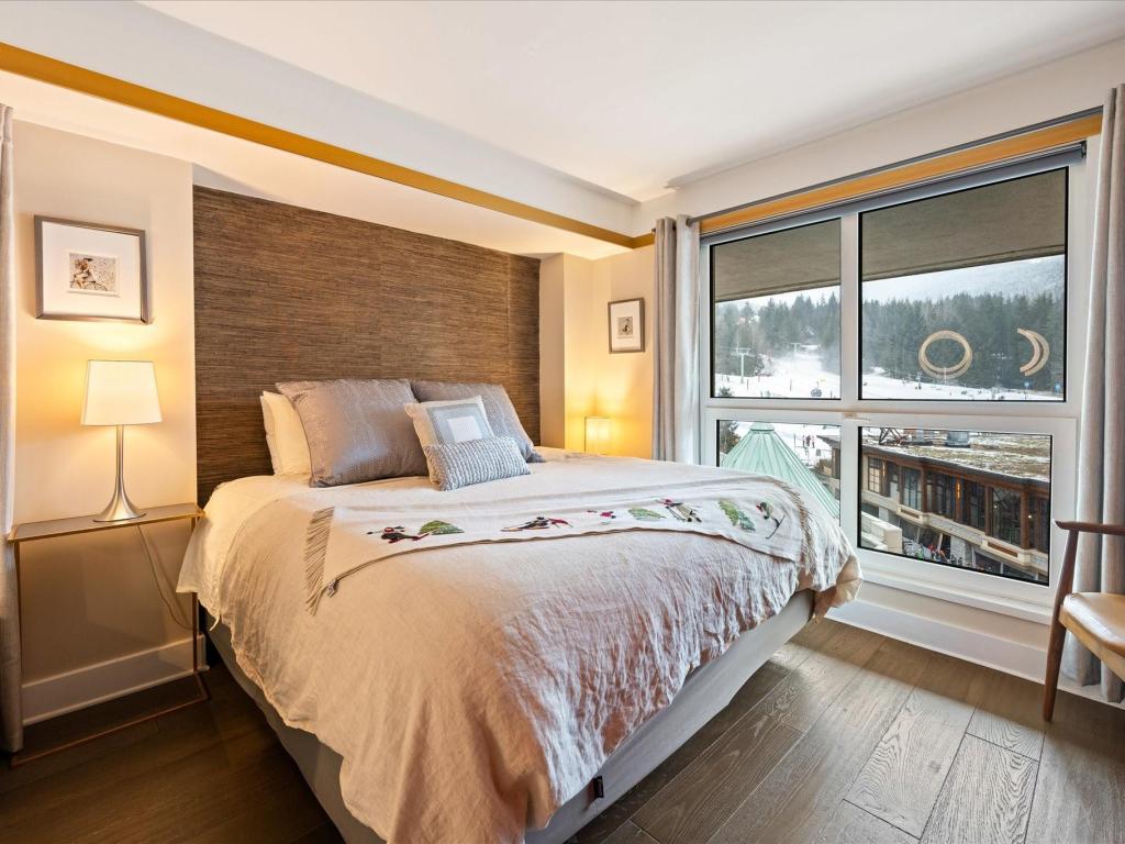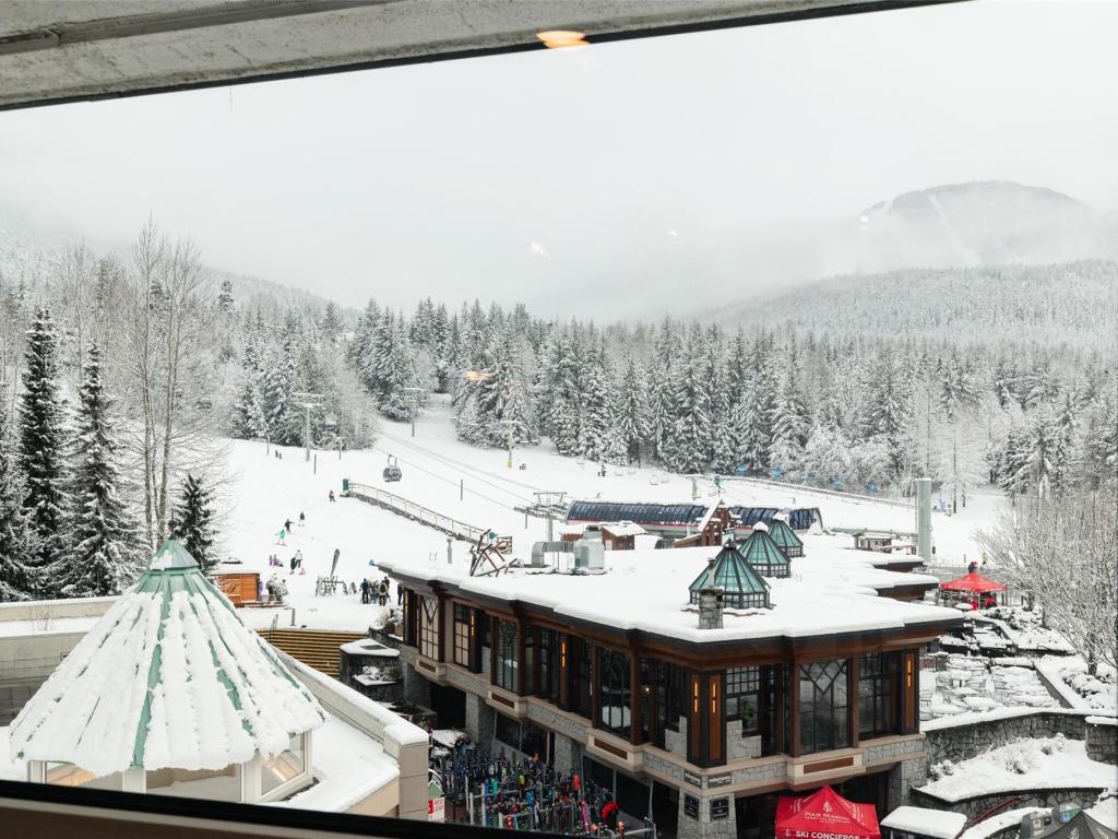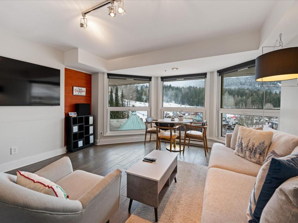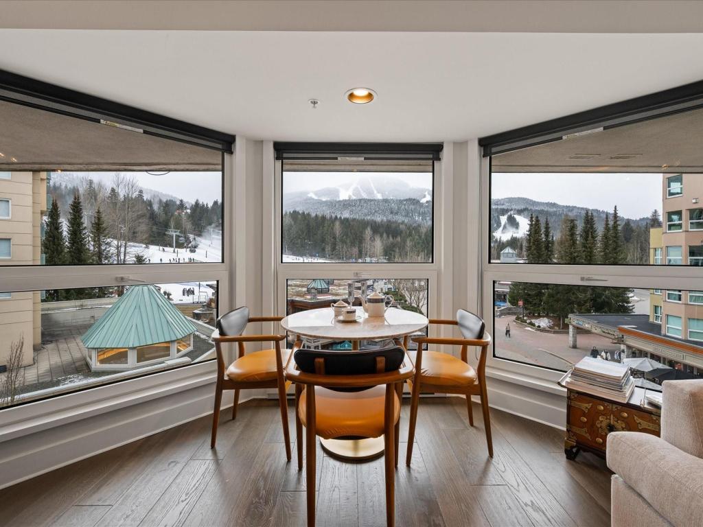 Perfectly located at the base of Blackcomb Mountain, this luxurious ski-in/ski-out residence offers direct, unobstructed views of the mountains, gondola, and Upper Village stroll from every window. A rare one-bedroom with private laundry, it features full, symmetrical living room windows which add balance and light - an uncommon detail in the building. Situated on the coveted 4th level, the highest and most sought-after floor for smaller units, this beautifully updated home benefits from Phase 1 nightly rental zoning, exceptional revenue history, and unlimited personal use. Enjoy resort-style amenities including a pool, hot tub, and gym—an elegant alpine retreat and investment.